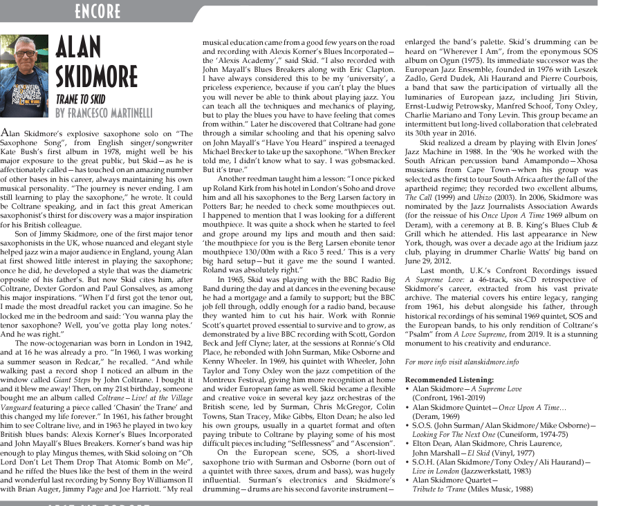 The prestigious jazz journal The New York City Jazz Record has picked up on the release of A Supreme Love Alan Skidmore’s six CD Box set published last month by Confront Recordings. He gets cover billing in the June issue.