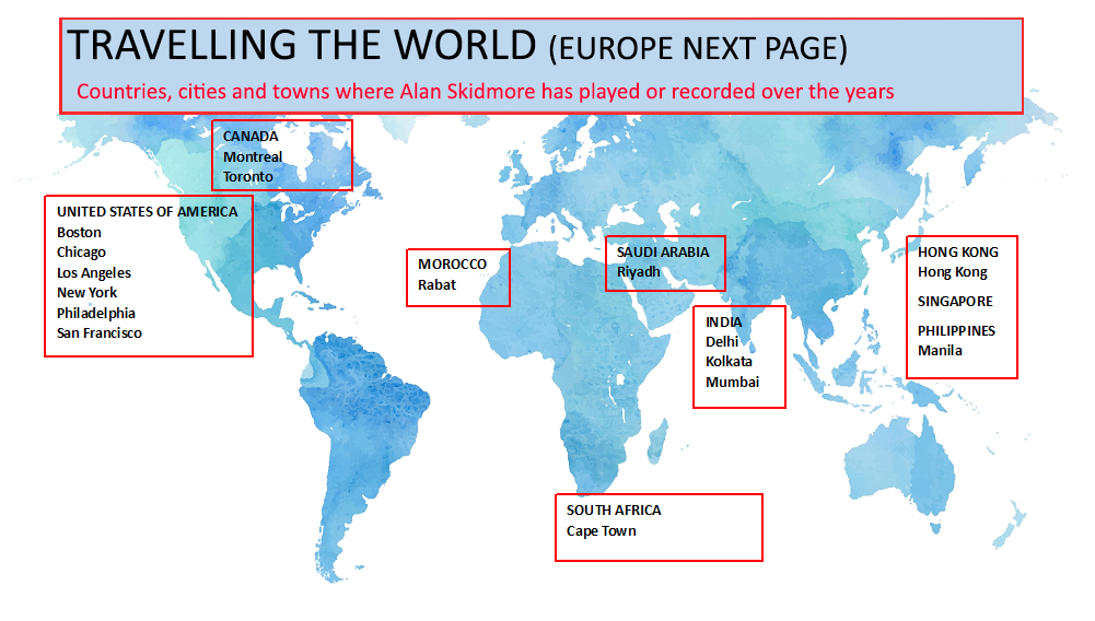 During his six decades in the music business Alan Skidmore has played in many venues around the world. Here are a couple of maps showing some of them. Other places may have been visited but are lost to the memory – tours are often very hectic and Alan may have forgotten some of the places he’s played. So if you saw him somewhere that’s not listed here do please let us know through the Contact form.